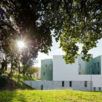 Der Neubau in Porto ist ein Wohnhaus mit einem sehr speziellen Programm: Kinder und Jugendliche, die eine Behandlung im onkologischen Zentrum Porto IPO erhalten, werden hier vorübergehend mit ihren Familien wohnen. 2014 gewannen die Architekten den Wettbewerb, im letzten Jahr wurde das Haus fertiggestellt. Schon während des Entwurfs war die Finanzierung des Gebäudes ein wichtiger Aspekt. Um ausschließlich mit Spenden bauen zu können, entwickelte man eine Strategie, derzufolge nur Materialien aus portugiesischer Herstellung Verwendung fanden.
