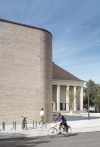 Mit dem Entschluss, die raumgreifenden Vorgängerbauten abzubrechen, ging die Entscheidung einher, sowohl die Sakristei als auch das Gemeindezentrum und den Kindergarten in einem gemeinsamen Neubau von gut 1.700 Quadratmetern Nutzfläche unterzubringen. Dreigeschossig schließt dieser Baukörper den Kirchenvorplatz nach Süden ab. Dem Bemühen, den Stadtraum zu fassen, kommt dabei das hervortretende Treppenhaus zugute, das den östlichen Abschluss betont. Insbesondere in der Kombination mit den beiden Okuli und der beigefarbenen Klinkerfassade lässt das konvexe Halbrund an architektonische Vorbilder denken, die im Stuttgarter Raum für öffentliche und nicht zuletzt auch für kirchliche Auftraggeber*innen entstanden sind.