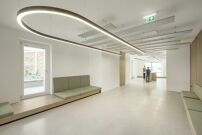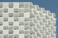 Auf 23.600 Quadratmetern Bruttogrundfläche finden sich neben den Wohnungen auch eine großzügige Lobby, Homeoffice-Bereiche für die Bewohner*innen und ein Postraum im Erdgeschoss. Im zweiten Obergeschoss gibt es einen Gemeinschaftsraum und eine begrünte Dachterrasse. Mit Lochblech an der Fassade, vorgehängten Sonnenschutzpaneelen aus Stahl, Bodenplatten und Untersichten aus Beton, Holz-Alu-Fenstern und Absturzsicherungen aus Glas ist das Außenbild weitgehend monochrom in Weiß gehalten. Innen gesellen sich Eichenholz, Terrazzo und Sichtbeton dazu. (sab)