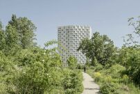 Oberhalb eines zweigeschossigen Sockels dreht sich das Hochhaus von Franz&Sue mit einem leichten Knick zu beiden Seiten aus der rechteckigen Grundfläche heraus. Der polygonale Turm bildet an den geraden und schrägen Kanten gestaffelte Freisitze aus, wofür die Architekt*innen nach eigenen Angaben ein „Fassadenstrickmuster aus luftigen und leichten Balkonfronten“ schufen. Dabei hätten sie sich von „Omas Schalstricken“ inspirieren lassen.