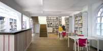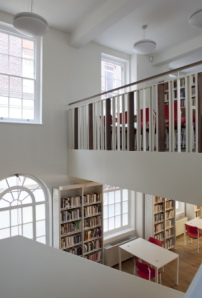 Den zurückhaltenden Blickfang im Gebäude bildet eine scharf geschnittene Treppe, die zur Bibliothek hinaufführt. Im oberen Zwischengeschoss der Bibliothek belebt eine gestaffelte Balustrade aus Stahl, Holz und Acryl den ansonsten ruhigen, weißen Raum. Eine Kombination aus hochwertigen Materialien und einfachen Oberflächen aus Birke und Eichenfurnieren bestimmt die Atmosphäre. Natürliches Licht und Blickbeziehungen zwischen den Räumen sorgen zusätzlich für Leben. Akzente setzen außerdem rote Acrylstreifen, die alle Räume formal miteinander verbinden.
