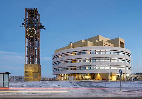 Einige Orte, an denen momentan mitten in der Nacht eine Sonnenbrille angebracht wäre, haben wir im jüngeren BauNetz-Archiv aufgespürt. Von einer einsamen Holzhütte in Hammerfest über das wandernde Sauna-Ei, das nach einer Weltreise nun in seine Heimat Lappland zurückgekehrt ist, bis hin zur Stadt Kiruna, die aus Sicherheitsgründen leider in Gänze wandern muss. Auch der Ausflug in die Regionen direkt südlich des Polarkreises lohnt, wo sich im Dämmerungszustand zu jeder Nachtzeit deutliche Konturen erkennen lassen – etwa beim Rathaus auf den Färöer-Inseln, einem Besucherzentrum in Island oder einem Rastplatz in Norwegen. Im Folgenden also Reisetipps kreuz und quer durch die vom Mittsommer geprägten, arktisnahen Regionen. (sab)