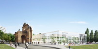 Einen ganz anderen Weg gingen Bruno Fioretti Marquez, deren schlichter Riegel in Öffentlichkeit und Presse viel Zustimmung fand. Programmatisch integrierten die Berliner*innen Portal und Neubau, was im Preisgericht „lebhaft und sehr kontrovers“ diskutiert wurde: „Der ablesbaren Kontinuität ohne Berührungshemmungen steht die Kritik gegenüber, dass die neu geplante durchgehende Fassadenwand zum Platz hin aus höchst unterschiedlichen Bauepochen stammt und nicht zum Verständnis beiträgt.“