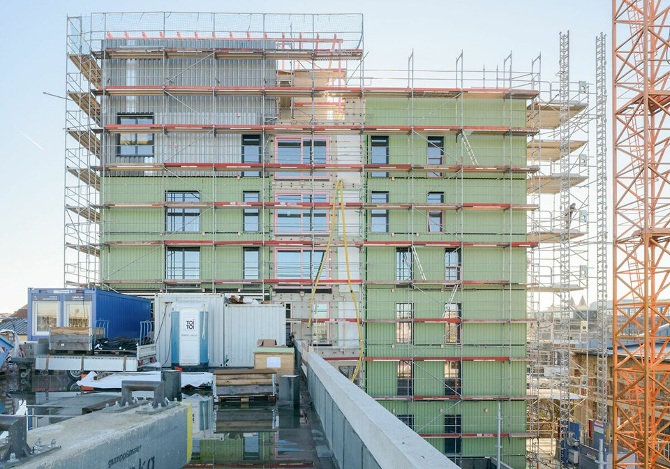 Der 30 Meter hohe Wohnturm, dessen oberster Fußboden exakt die Hochhausgrenze einhält und von einer Co-Working-Galerie mit Dachterrasse gekrönt wird, entstand in elementierter Holzbauweise. Die Außenwandelemente samt Fenster und Absturzsicherungen hätten „genau den Grad an Vorfertigung, der uns hilft, so etwas wirtschaftlich umzusetzen und die Zeit auf der Baustelle zu reduzieren“, erklärt Hofmann.