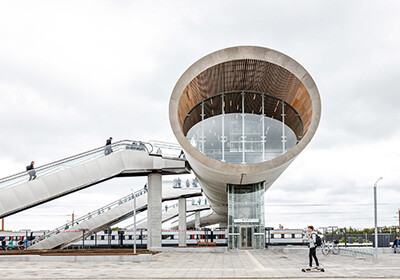 Piety Bridge, durch die Passanten die Flutmauern und Bahngleise überwinden können. Auf den Färöer-Inseln wiederum stülpt sich das Rathaus von