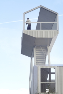 Ob sich die Namensfindung allein auf den ähnlich klingenden Stadtnamen bezieht oder ob es darüber hinaus Parallelen zu Pussy Galore, dem trapeztanzenden Bond-Girl aus „Goldfinger“ ziehen lassen, dazu schweigen die Architekten. Die Konstruktion des Aussichtsturms dürfte jedoch in ihrer Komplexität einem Trapezakt gleichen: Die 12 Meter hohe weiße Stahlkonstruktion ist ein filigranes Gerüst aus vier aufeinander balancierenden Silhouetten einfacher Satteldachhäuser. „Je nach Blickwinkel ergibt sich die Illusion, dass einzelne Kuben zu Boden gleiten“, erklären die Architekten ihren Entwurf, der an eine Mischung aus Herzog de Meurons Vitra-Kaufhaus und Robert Venturies Ghost Structures erinnert. Durch die Hausgerippe hindurch führt eine offene Treppe zur Aussichtsplattform mit ihrem 360 Grad Blick über Park und die Seine.