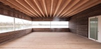 Den eher geschlossenen Baukörper durchlöchern scheinbar willkürlich gesetzte Fenster verschiedener Größe mit asymmetrisch aufgeteilten Profilen. In Seenähe gelegen, erinnert der flache dunkelgrau-hölzerne Baukörper optisch an einen hölzernen Bootssteg.