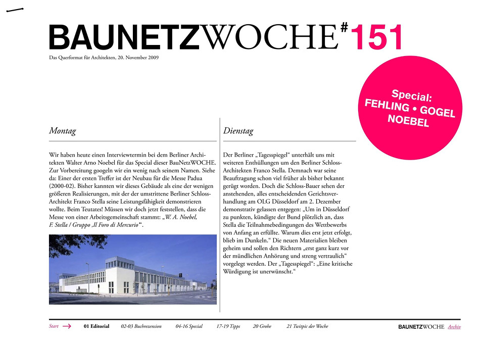 - Special: Die Berliner „Spätexpressionisten“ Fehling+Gogel werden derzeit in einer Ausstellung neu entdeckt. Walter Noebel war in den siebziger Jahren Praktikant, Mitarbeiter und Projektpartner des Büros und erzählt Anekdoten aus der letzten produktiven Phase dieser eigenwilligen Architekten.