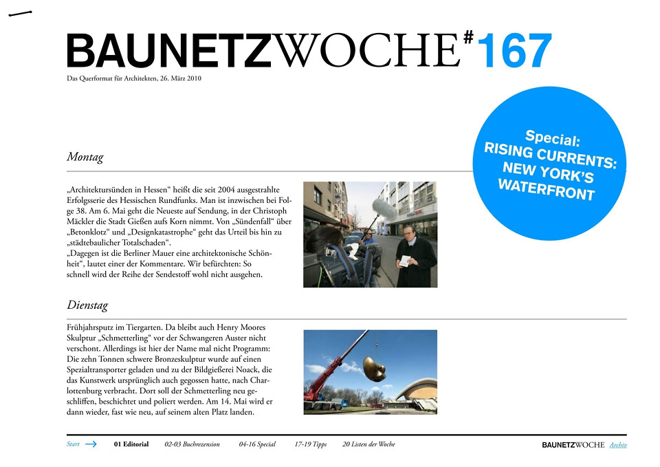 - Unter den Vorzeichen von Klimawandel und steigendem Meeresspiegel zeigt die Ausstellung „Rising Currents: Projects for New York’s Waterfront“ im Museum of Modern Art (MoMA), wie sich die Metropole schützen kann. Die BAUNETZWOCHE berichtet von Austern, Algen und Altglas.