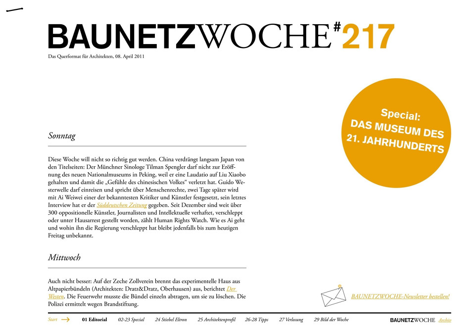 - Spezial: In Berlin liefert ein „jung und wild“ besetzter Wettbewerb eine Menge Ideen für radikale neue Ansätze eines „Museums“, beteiligt waren unter anderem Kuehn Malvezzi, Graft, J Mayer H, raumlaborberlin, atelier le balto, Sou Fujimoto, Brandlhuber+ und Office Kersten Geers David van Severen. Warum die Entwürfe bislang dennoch unveröffentlicht geblieben sind, erzählt die neue Ausgabe der BAUNETZWOCHE.