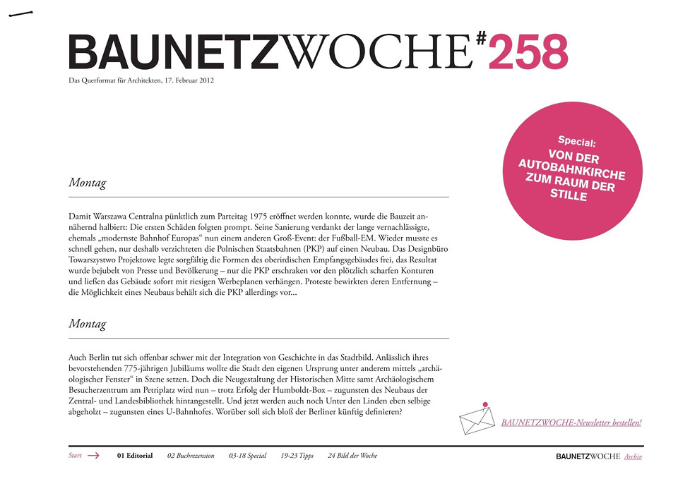 - Special: Architecture against speed – Mit der Automobilisierung entstanden Autobahnkirchen zum Zweck der „Entschleunigung“. Wie werden heute überkonfessionelle „Räume der Stille“ als Ruheoasen im Alltag gestaltet?