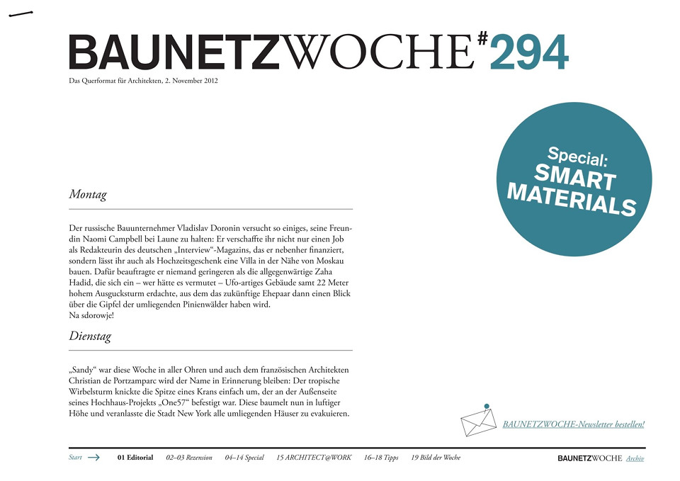 - Special: Die Architekturgeschichte ist geprägt durch Innovationen und Erfindungen, und gerade in den letzten Jahren hat der Forschungsanspruch weiter zugenommen. Steigende Anforderungen an das Bauen, neue Gesetze und Vorschriften sowie zunehmend technischer werdende Planungsprozesse fordern auch komplexere und intelligentere Materialsysteme: Smart Materials!