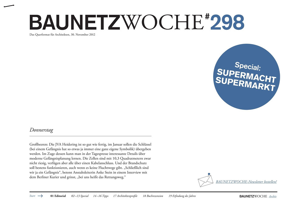 - Happy Shopping: Die Zeiten zweckmäßiger Hallentragwerke mit kalter Neonbeleuchtung sind gezählt. Ob in Gold verpackt, mit einem besonderen Dach oder gleich als Paradies – Supermärkte sind für Architekten eine anspruchsvolle Herausforderung geworden.