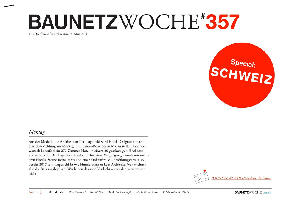 - Special: Für das Gastland der Leipziger Buchmesse ist die Moderne eine Selbstverständlichkeit – sagt der Verleger Lars Müller. Und weiter: „Es wäre toll, wenn die Schweiz so modern wäre, wie sie aussieht.“ Unser Special lässt neben Lars Müller auch Hubertus Adam, Direktor des S AM Basel, sowie Dimitri Kaden und jede Menge andere junger Schweizer Architekten zu Wort kommen