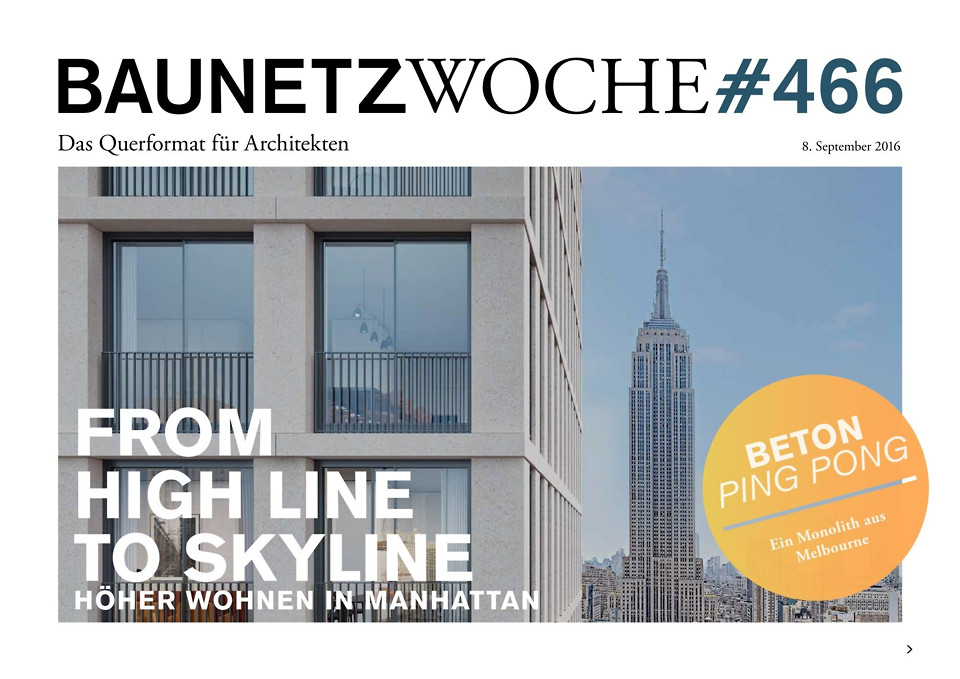 - Betongold: Gestapeltes Wohnen, gestaffelte Preise: Zehn Millionen Dollar für ein Apartment im Hochhaus von David Chipperfield oder bis zu 50 Millionen Dollar für das Triplex-Penthouse im Hadid-Turm? In Manhattan boomt der Bau von Luxus-Hochhäusern mit Miet- und Kaufpreisen, denen nach oben keine Grenzen gesetzt sind, entworfen von Architekten wie Bjarke Ingels, Tadao Ando, Rafael Viñoly, Norman Foster und Herzog & de Meuron