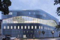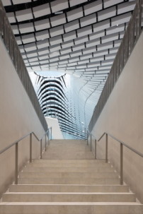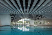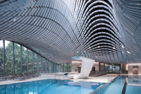 Hier finden sich je ein Sport- und ein Sprungbecken, ein Kinderplanschbecken sowie ein Wellness-Pool. Alles wird überspannt von der sanft geschwungenen Keramikdecke, die sich in der westlichen Gebäudehälfte zu einem steil nach oben gerichteten Trichter aufbauscht. Jene Decke, das von ihr einfallende Tageslicht und die Ausrichtung ihrer Elemente, entfalten eine regelrechte Sogwirkung. Und diese breitet sich in das von Terrazzo und Stein geprägte zentrale Treppenhaus bis in Richtung Badehalle und Wellnessbereich aus, in dem es sich in vier Panoramasaunen und einem Dampfbad nackert über der Stadt schwitzen lässt. (kms)