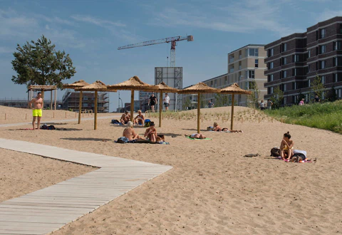 Darüber hinaus zeigen Strand- und Flussbadprojekte, dass sie nicht nur ergänzende oder gar neue Strukturen für Erholung und Bewegung sind. Beispiele wie das Gemeindezentrum bei Montreal beweisen, dass ein Zugang zum Wasser auch Ankerpunkt für die Gemeinschaft werden kann. Im näher gelegenen Bremen werden Freizeit und Hochwasserschutz verbunden: Wo die Weser zwar nicht zum Schwimmen einlädt, kommen auf der von A24 Landschaftsarchitekten geplanten Anlage trotzdem Strandgefühle auf.