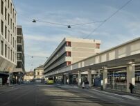 Schräg gegenüber eines markanten Bürogebäudes von Christ & Gantenbein steht nun der neue Bahnhofsbau mit vier oberirdischen Geschossen. Der lange Riegel endet an einem Platz mit mehreren historischen Bauten. Das Erdgeschoss ist visuell durchlässig gestaltet und nimmt ein Bahnreisezentrum sowie weitere Verkaufs- und Dienstleistungsflächen auf. Der Zugang zu den Gleisen erfolgt unterirdisch, sodass auch dort Gewerbeflächen angeordnet werden konnten. Das zweite Haus ist etwas kürzer, aber dafür mit sieben Stockwerken deutlich höher. In den oberen fünf Etagen wird hier in 23 Mietwohnungen gewohnt. Rund 10.700 Quadratmeter Bruttogrundfläche umfassen beide Bauten insgesamt.
