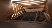 Den Konzertsaal, der mit dem rückwärtigen Teil im Fels verankert ist, beschreiben die Architekten mit der Metapher des „freigelegten Juwels“, der sich im Materialwechsel vom hellen Foyer in den mit Holzoberflächen und gedämpften Farben gestalteten Konzertsaal ausdrücke.