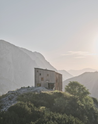 Dietger Wissounig Architekten entwarfen eine schlichte Kubatur mit südlich orientiertem Pultdach, deren Position und Ausrichtung den Faktoren Topographie, Wetterseite und Ausblick geschuldet sind. Die hinterlüftete Fassade ist mit sägerauen, naturbelassenen Lärchenholzlatten bekleidet, die sich durch Witterung an die Umgebung angleichen wird. Insgesamt finden 58 Besucher*innen in der Herberge einen Schlafplatz, hinzu kommen sechs weitere Betten für Personal. Die Zimmer befinden sich im ersten und zweiten Obergeschoss, während das Erdgeschoss einen offenen Speiseraum mit großer Küche für die Bewirtung aufnimmt. Im Haus dominieren sichtbar belassene Holzoberflächen das Raumbild.