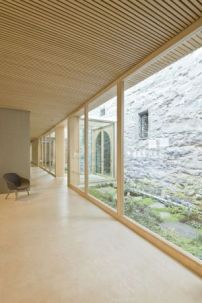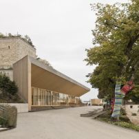 Dieser Baukörper wurde unterhalb des Schlosses sozusagen als Fortsetzung des Hangs um den wehrhaften Comturey-Turm herum gebaut. Die Architekten verzichten dabei auf große Gesten: Die aufwändigen Baumaßnahmen sind dem eleganten Holzband – das von einer 103 Meter langen Stahlbetonkonstruktion getragen wird – nicht anzusehen. Aus der Nähe betrachtet hebt sich die bis zu 4,50 Meter auskragende Holzdachkonstruktion, die sich trichterförmig zum Gebäudeinneren verjüngt, hervor.