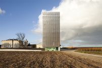 In der Weite der Felder Südfrankreichs kommt dieser metallisch schimmernde Turm etwas seltsam daher. Man fragt sich, was eigentlich hinter diesem befremdlich wirkenden Bau an der Seite des Gruaud-Larose stecken mag. Die Lösung ist naheliegender als gedacht: Es geht um Wein. Der Besitzer des Weinguts beauftragte das Büro Lanoire & Courrian aus Bordeaux, neben dem Herrschaftshaus aus dem 18. Jahrhundert ein Besucherzentrum zu errichten.