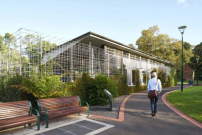Durch die Neugestaltung eines alten Wartungsdepots konnte dessen Fläche von 9.000 Quadratmeter auf 4.500 Quadratmeter reduziert werden – und zusätzlich das Besucherzentrum mit Café im 150 Jahre alten Park errichtet werden. Gänzlich dem Gedanken der Nachhaltigkeit verschrieben, fällt das Volumen erst einmal nicht sonderlich auf. Grüne, mit Pflanzen bewachsene Gitterwände an den Längsseiten verstecken den dahinter liegenden modernen Flachbau und führen so den Gartengedanken konsequent fort. Von dieser energieeffizienten Naturwand profitieren auch die Elemente des absichtlich unaufdringlichen Informationszentrums, von der Isolierung über die Belichtung und Belüftung bis hin zu Wasserverbrauch und Kühlung. Das Dach wurde mit Solarmodulen versehen.