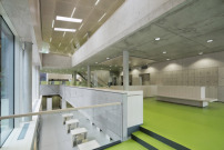 Perforationen der Fassade, Deckenausschnitte und Lufträume inszenieren Ein-, Durch- und Ausblicke: Historische und zeitgenössische Elemente der unmittelbaren Umgebung – das historische Pumphaus oder die verkehrsreiche Straße mit ihren Tankstellen – collagieren sich für den Bibliotheksnutzer und sorgen für Ablenkung beim Arbeiten.