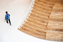 Formale Hinweise auf das kurvige Innere geben die insgesamt drei Einschnitte in das auf einer rechteckigen Kiste basierende Gebäudevolumen. Sie lassen den Neubau dynamischer erscheinen und in einen Dialog mit der Umgebung treten. Ein Einschnitt in der Erdgeschosszone schafft einen überdachten Outdoorbereich für Eingang und Café, während in den oberen Geschossen Terrassen mit Sichtbeziehungen zum Hafen und Richtung Innenstadt entstehen. (lr)