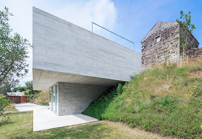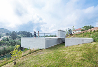 Diese haben im Nordwesten Portugals eine besondere Tradition: Sie waren gemeinschaftlich genutzte Orte, an denen man seine Kleidung wusch. Carvalho Araújo entdeckte die „Lavadouros“ eher zufällig auf Fotos, die Bewohner alter portugiesischer Dörfer beim Wäsche waschen zeigten. Dieser alltägliche Brauch, der mit Einzug der Waschmaschine sein Ende fand, diente dem Architekten als Referenz für seinen Neubau, der sich formal zwar als Fremdkörper in Serra d’Arga behaupten muss, aber alles andere als ein Alien ist. Es ist vielmehr ein kompakter Tempel, der sich in einen leichten Hang schiebt, als würde er versuchen, in der Landschaft zu verschwinden.