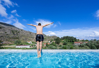 Am Anfang stand das Bild eines Wassertanks. Der portugiesische Architekt José Manuel Carvalho Araújo baut gerne mit der Landschaft. Das Zentrum seiner „Refúgio na Montaria“ bildet ein Schwimmbad unter freiem Himmel, das sich nicht ohne Stolz über die felsige Umgebung der Serra d’Arga erhebt. Der Neubau, ein Ferien- bzw. Wochenendhaus für einen Arzt, hebt sich zwar von den benachbarten Wohnhäusern ab, hat aber dennoch einen traditionellen Bezug. Der Architekt orientierte sich für seinen Betonkubus an den „Lavadouro“, den typischen Wassertanks der Region.