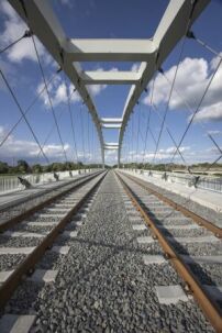 Die 266 Meter lange Hauptbrücke wird von einem eleganten Bogen mit einer Spannweite von 130 Metern überragt. Dazwischen spannt sich das Carbonnetz auf. Teil des Projekts war außerdem der Ersatzneubau einer 176 Meter langen Brücke über die Odervorflut und die Erneuerung der Gleisanlage auf dem Streckenabschnitt. (da)