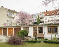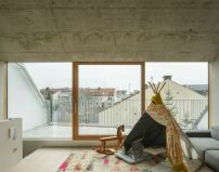 Der schmale Baukörper mit einer Nutzungsfläche von rund 290 Quadratmetern fügt sich recht unauffällig in den Straßenzug ein. Großformatige Aluminiumfenster versuchen, zwischen den verschiedenen Geschosshöhen und Öffnungen der Nachbarn links und rechts zu vermitteln. Die grauen Betonfertigteile der Fassade – zu denen drei gebäudebreite, T-förmige Elemente gehören – korrespondieren mit den gedeckten Weiß- und Beigetönen der umgebenden Putzfassaden. Das Giebeldach aus Beton erhielt straßenseitig eine Gaube und wurde in Richtung Hof mit PV-Modulen versehen.