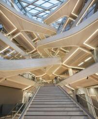 Die Bankzentrale bezieht sich nicht nur in ihrem Höhenverlauf auf diesen Bestand, sondern stellt auch in ihrer Materialwahl Gemeinsamkeiten her – wenngleich in ihrer äußeren Erscheinung zunächst das Bild von Glas und dunklem Stahl überwiegt. Die Fassaden werden ringsum von vertikalen Glasschwertern gesäumt, die dem Baukörper einen großstädtischen Ausdruck geben, Einblicke ins Innere zulassen und die Büroflächen vor zu viel direkter Sonneneinstrahlung schützen. Dass es sich um einen Holzbau handelt, wird jedoch spätestens beim Betreten der großen Lobby klar. Innen dominiert das Holz an Decken und Brüstungen, helle Holzträger liegen offen. Während sich das Äußere des Gebäudes dunkel und scharfkantig gibt, ist es innen hell und geschwungen. Das gilt insbesondere für die spektakuläre Treppenanlage, die sich im zentralen Atrium nach oben zum Dach aus Glas und Holz hebt.