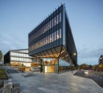 Skandinavien geht im Holzhybridbau weiter voran. Mit dem Finanzparken Bjergsted ist im norwegischen Stavanger nicht nur eine imposante neue Bankzentrale, sondern auch eines der größten Bürogebäude in Holzbauweise in Europa entstanden. Der Entwurf stammt von Helen & Hard (Stavanger/Oslo), die hier sowohl mit einem zweiten Architekturbüro, SAAHA (Oslo/Sarajevo), als auch mit den Holzbauspezialisten Creation Holz (Herisau, Schweiz) sowie dem Ingenieurbüro Degree of Freedom (Oslo/Valencia/Athen) zusammenarbeiteten. Die Arbeitsgemeinschaft hatte mit ihrem Entwurf 2014 den internationalen Wettbewerb des norwegischen Bankkonzerns gewonnen.