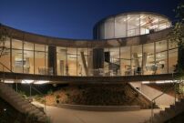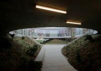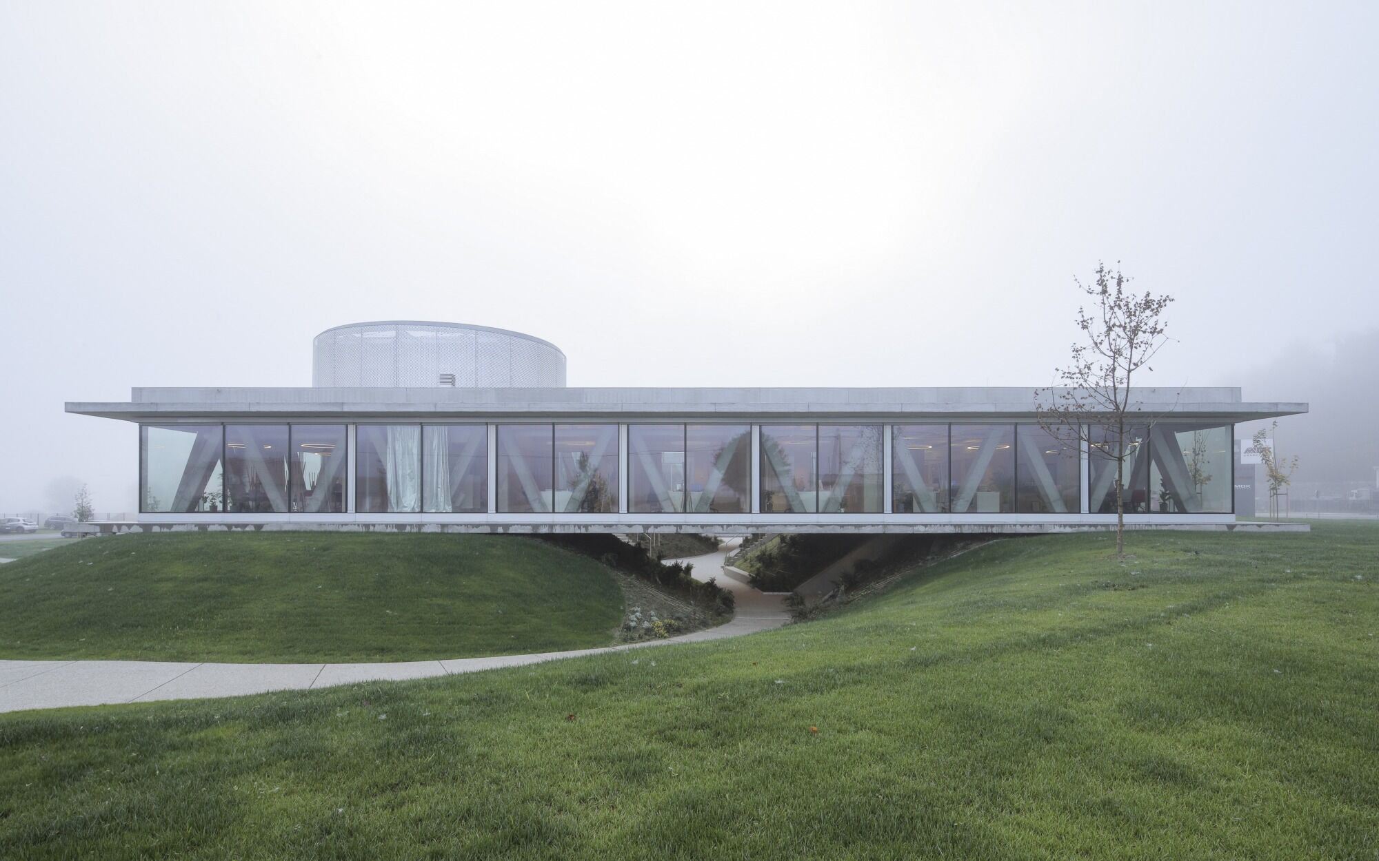 Grundlage des Projekts bildet die modellierte Topografie mit drei begrünten Hügeln, die einen zentralen Freiraum und die Durchwegung definieren. In diese Hügel sind technische und gemeinschaftliche Nutzungen (etwa die Cafeteria) sowie die Produktion integriert, schreiben die Architekt*innen. Auf den Hügeln liegt ein eingeschossiger Baukörper über quadratischem Grundriss, der um ein zentrales, kreisförmiges Atrium organisiert ist. Konstruiert wurde auf bewährte Art und Weise in Stahlbeton, mit zwei vorgespannten Betondecken, V-förmigen Stützen an der Fassade und vier tragenden Kernen. Die innere Organisation des Hauptgeschosses erfolgt durch nichttragende Trennwände.
