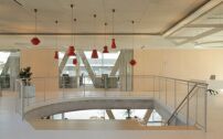 Die Büroflächen sind flexibel angeordnet und bieten unterschiedliche Arbeitsformen. Entlang der Fassade befinden sich geschlossene Büros, Besprechungsräume und Arbeitsnischen. Zum Atrium hin punktet der Entwurf mit einer offenen zentrale Erschließungs- und Kommunikationszone, die in den veröffentlichten Fotografien leider etwas unterbelichtet bleibt. Hier befinden sich Empfang, offene Arbeitsplätze, ein Präsentationsraum und ein kleines Auditorium, das sich als offene Tribüne zum Sockelgeschoss hinab orientiert.