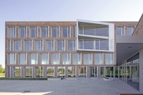 Mit der Anordnung der bodentiefen Holz-Aluminium-Fenster vermeiden die Architekten bewusst eine Etagenbänderung der Klinkerfassade. Die Geschossdecken sind über Betonkernaktivierung in Verbindung mit Geothermie und Fernwärme Teil des Energiekonzeptes. Über Heizkörper und öffenbare Fenster kann jeder Mitarbeiter sein Raumklima selbst steuern. Auch der außenliegende Sonnenschutz wird individuell bedient.