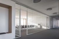 Um gestalterisch wie auch wirtschaftlich nachhaltig zu sein, soll der Riegel verschiedene Bürotypologien und Größen an Nutzungseinheiten aufnehmen können. Aus Datenschutzgründen forderte der Bauherr allerdings für die oberen Geschosse klassische Bürozellen mit Erschließung über den Mittelflur. Die Architekten öffnen Sonderfunktionen wie Empfang und Konferenzraum durch Glastrennwände, um ein großzügigeres Raumgefüge zu erreichen. Die unteren Geschosse sind frei einteilbar.