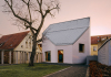 Der flache Gebäudeteil mit markant geneigtem Dach beinhaltet einen großen Seminarraum und ist durch das Eingangsfoyer mit dem Büroriegel verbunden. Durch den spitzen Winkel der Glasfassade sind Besucher schon vor dem Eintreten vom Empfangstresen aus sichtbar. Repräsentiert diese Raumsituation den heutigen Transparenz-Begriff? Jedenfalls passt die sachliche Architektur gut zum Apothekerverband – die schönen Details und flexiblen Grundrisse sollten auch die Mieter in den unteren Geschossen überzeugen. (dd)