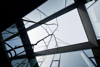 Im Innenraum entsteht das gegenteilige Bild: die hölzernen Fensterrahmen geben spezifische Ausschnitte der Umgebung wieder.
