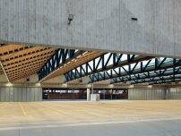 Die Busgarage ist dank großer Fachträger aus Stahl, die die Halle überspannen, stützenfrei ausgeführt. Ein Sheddach wird fast durchgehend für eine Photovoltaikanlage genutzt. Durch die massiven Außenwände aus Beton und die geschlossenen Fassaden wird die Nachbarschaft vom Betriebslärm abgeschirmt. Der rohbelassene Ortbeton unterstreicht die monolithische Gestalt des Bauwerks: Eine senkrechte Lattung dominiert die umlaufende, durch Tore unterbrochene Hallenfassade, eine 45-Grad gedrehte Lattung der Ortbetonschalung verstärkt optisch die Kraftlinien der tragenden Wandelemente. Und eine ringförmige, kleinteilige Struktur betont die runden Fenster, die die homogene Struktur der Außenhaut gekonnt unterbrechen. Kontrastierend zum rohen Beton sind die Personal- und Büroräume mit warmem, hellen Holz ausgestattet.