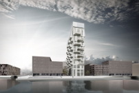 Zuständig für die Verwandlung der schroffen Betonscheibe in ein luxuriöses Wohnhochhaus mit öffentlichen Nutzungen ist das dänisch-deutsche Büro COBE (Kopenhagen/Berlin). Um das geschlossene Volumen überhaupt nutzbar zu machen, sieht der Entwurf eine neue skulpturale Fassade mit zapfenartig auskragenden Balkonen vor.