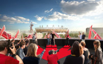 Eine spiralförmig nach oben verlaufende Rampe führt die Besucher auf eine Dachplattform, von der aus sie einen weiten Blick über den olympischen Park genießen können. Die Softdrink-Marke will mit dem Pavillon natürlich nichts anderes bezwecken, als rund vier Milliarden Olympiade-Interessierten weltweit Musik, Sport und wahrscheinlich auch Architektur näherzubringen.
