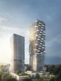 In der Überlagerung der Hotelnutzung und des Wohnungsmixes ergibt sich als kleinster gemeinsamer Nenner das Fassadenmodul von 2,10 Metern. Pro Geschoss sind laut Architekten unterschiedliche Wohnungstypen in unterschiedlicher Anordnung möglich Das Fassadensystem lasse zu, dass jede Wohnung einen privaten Außenraum erhält. Mit der nach oben über die Fassade umlaufenden, diagonal versetzten und konsequent spiralförmigen Anordnung wollen Cyrus Moser dem Eindruck des rigiden programmatischen Stapelns entgegenwirken. Schon Ende des Jahres könnte mit dem Bau begonnen werden.