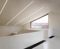 Aufregender wird es im dritten Obergeschoss, das durch den Ausbau des Daches entstand. Die groben, einst ausschließlich konstruktiv gedachten Backsteinwände sind hier erhalten geblieben. Dabei bestehende Enfilade wurde durch die monumentale Ausformulierung der Türwandungen in grauem Stein zusätzlich betont. Das Ergebnis ist eine eigenartige Mischung aus Carlo Scarpa und Rafael Moneo, die aber in jedem Fall eine gewisse Wirkung entfaltet. Neben Ausstellungsräumen der Stiftung gibt es dort auch ein Café, ein Auditorium sowie eine etwas zurückgesetzte Dachterrasse. Auch Arbeitsplätze für externe Projektpartner*innen werden hier bereitgestellt. Repräsentative Büros für die Versicherung selbst gibt es in den unteren Geschossen.