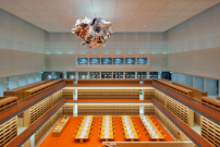 Noch sind die Regale leer und warten auf Inhalte. Heute wurde am Standort Unter den Linden der Schlüssel für den neuen Lesesaal der Staatsbibliothek Berlin übergeben. Unter der künstlerischen Leitung von HG Merz Architekten – das Tragwerk für den Glaskubus hat das Stuttgarter Büro zusammen mit Werner Sobek geplant – wurden neben dem Allgemeinen Lesesaal der Rara-Lesesaal sowie die Tresor- und Freihandmagazine fertig gestellt. Nach zwölfjähriger Bauzeit ist damit der zweite Teil des ersten Bauabschnitts eingeweiht. Die Inbetriebnahme wird im März nächsten Jahres sein, die Eröffnung des Komplettumbaus der Staatsbibliothek mit samt der Sanierung des südlichen Gebäudeteils ist für 2016 vorgesehen.