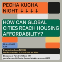 Hierzu laden die Organisator*innen zu einer Pecha Kucha Nacht in die Halle des Frankfurter Produktionshauses Naxos ein. Im Vorfeld konnten sich Interessierte um das Halten eines Kurzvortrags bewerben. 16 ausgewählte, bildgestützte Inputs à 6:40 Minuten zur Frage „Wie können Städte bezahlbaren Wohnraum schaffen?“ sollen das Themenfeld aufspannen, das den diesjährigen Schwerpunkt der Reihe bildet: Welche Prozesse und Mechanismen führten zum großen Erfolg vom Neuen Frankfurt und der Weißen Stadt Tel Aviv? Können damalige Prozesse und Instrumente auch in die heutige Zeit übertragen werden?