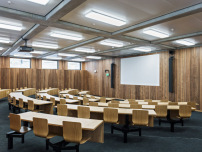 In der Innenausstattung verhält sich der Bau gekonnt zwiespältig: Sowohl imposante Materialien wie roter Marmor als auch raue Betonplatten werden miteinander kombiniert. In einigen Räumen sind die Wände mit dunklem Holz verkleidet. Auf eine eigentümliche Weise mischt sich hier gediegener Konservatismus mit einer Purismus-Ästhetik. (pg)