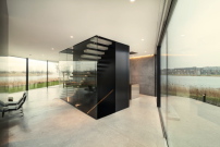 Die Architekten haben eine auf den ersten Blick simple Black Box entworfen, die jedoch subtil mit der Geometrie des Grundstücks spielt. Zwei Wände stehen parallel zu den Grundstückgrenzen, die beiden anderen in einem leichten Winkel. An der Nordseite wird das Volumen zur Inselspitze hin „gedrückt“, um maximale Sonneneinstrahlung einzufangen. Das Volumen wird teilweise ausgeschnitten, Panoramafenster werden eingeschnitten und andere Öffnungen introvertiert ausgestaltet. Die eingezogene Verglasung an der Westecke des Erdgeschosses verstärkt das Gefühl der „Offenheit“.